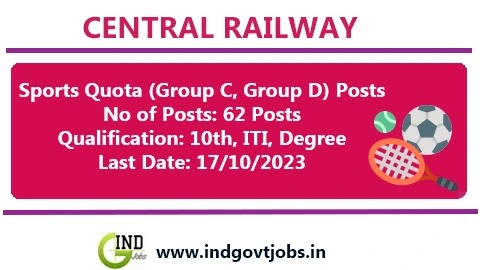 Central Railway Recruitment Notification of Sports Quota 2023-24: Railway Recruitment Cell (RRC), Central Railway, Mumbai invites online applications form eligible sports persons both Male and Female who are citizens of India, for filling up 62 posts of Group ‘C’ and Group ‘D’ posts against Open Advertisement Sports Quota for the year 2023-2024 over Central Railway. The Central Railway Sports Quota 2023 posts are open to all Community, but no reservation for reserved category (SC/ST/OBC). The Central Railway Sports Quota Recruitment 2023 online registration of application is closing on 17th October 2023.
